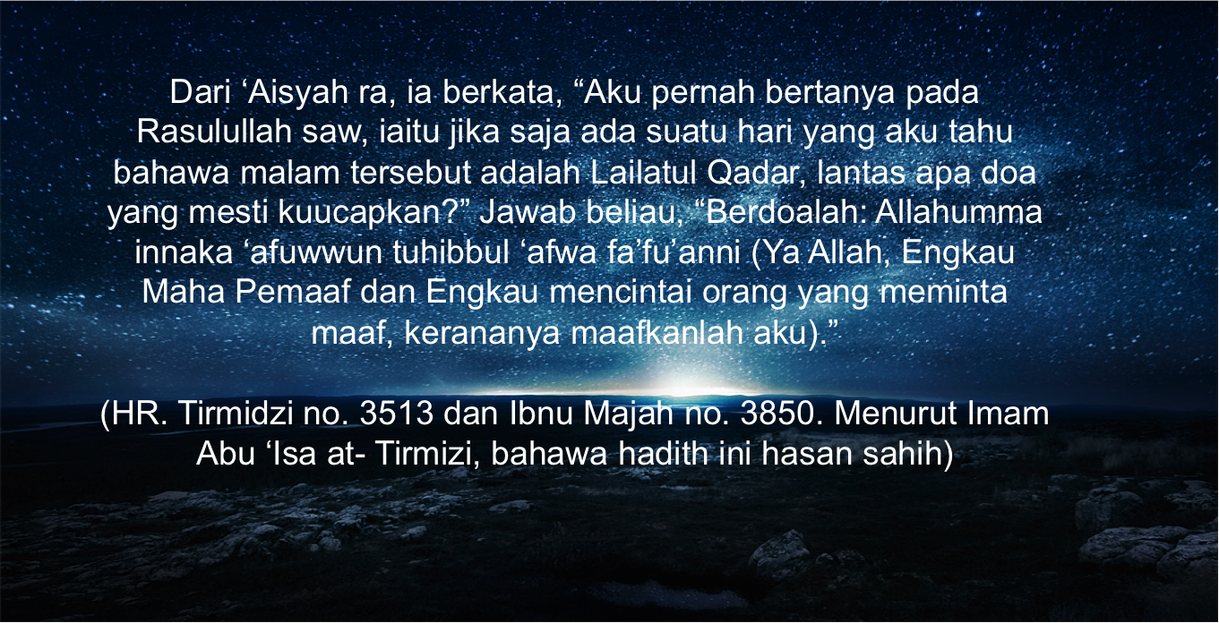 Dari ‘Aisyah ra, ia berkata, “Aku pernah bertanya pada Rasulullah saw, yaitu jika saja ada suatu hari yang aku tahu bahawa malam tersebut adalah Lailatul Qadar, lantas apa doa yang mesti kuucapkan?” Jawab beliau, “Berdoalah: Allahumma innaka ‘afuwwun tuhibbul ‘afwa fa’fu’anni (Ya Allah, Engkau Maha Pemaaf dan Engkau mencintai orang yang meminta maaf, kerananya maafkanlah aku).”