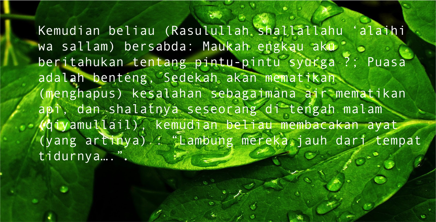 Kemudian beliau (Rasulullah shallallahu ‘alaihi wa sallam) bersabda: Mahukah engkau aku beritahukan tentang pintu-pintu surga ?; Puasa adalah benteng, Sedekah akan mematikan (menghapus) kesalahan sebagaimana air mematikan api, dan shalatnya seseorang di tengah malam (qiyamullail), kemudian beliau membacakan ayat (yang artinya) : “Lambung mereka jauh dari tempat tidurnya….”.