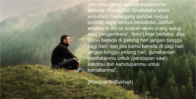 Dari Ibnu Umar radhiallahuanhuma berkata: Rasulullah Shallallahu’alaihi wasallam memegang pundak kedua pundak saya seraya bersabda: Jadilah engkau di dunia seakan-akan orang asing atau pengembara“, Ibnu Umar berkata: Jika kamu berada di petang hari jangan tunggu pagi hari, dan jika kamu berada di pagi hari jangan tunggu petang hari, gunakanlah kesihatanmu untuk (persiapan saat) sakitmu dan kehidupanmu untuk kematianmu“.